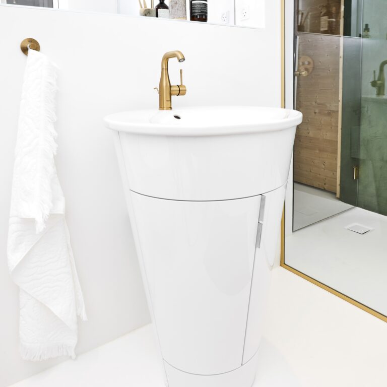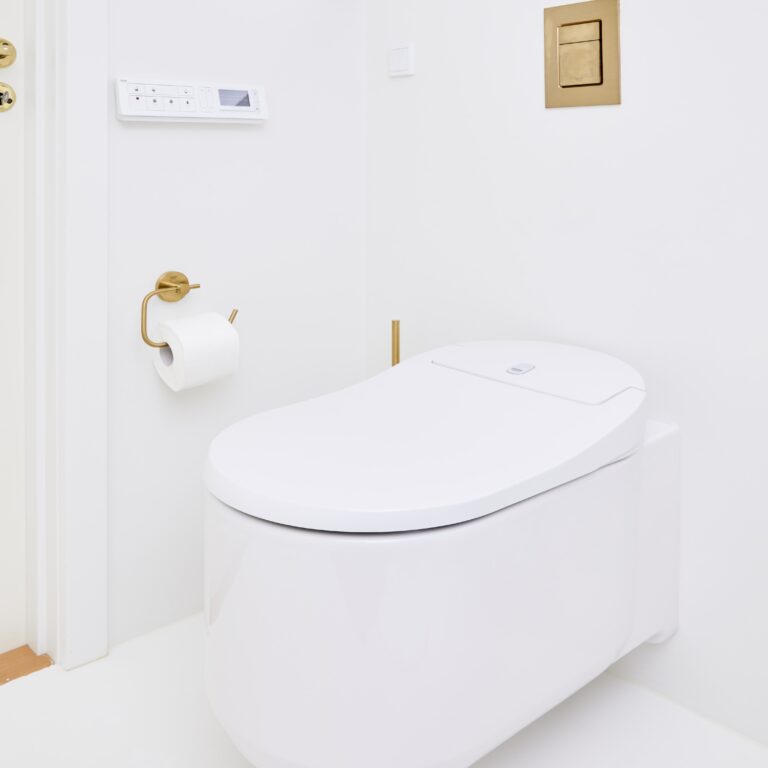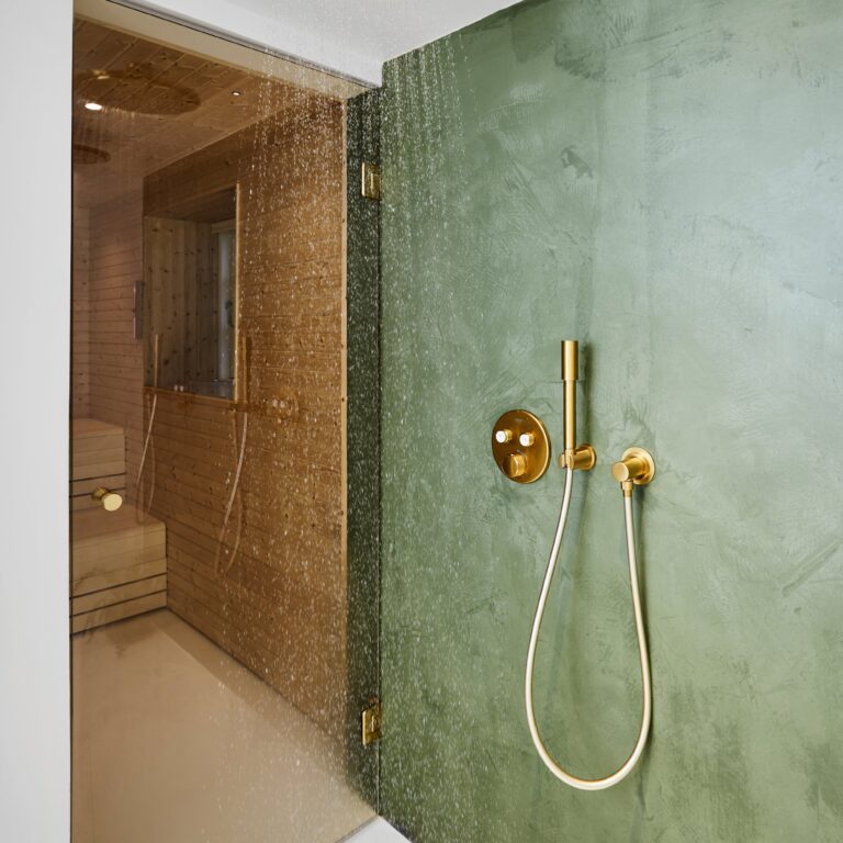 De lyse overflader danner en charmerende kontrast til de farverige accenter, hvilket skaber en luksuriøs atmosfære af forkælelse. Her kan man varme op i saunaen og køle ned i en brusebad, der simulerer en kølig sommerregn. Den minimalistiske elegance fremhæves af de rene linjer på gulve fra Jensen Gulve Aps og ubrudte flader, lette at vedligeholde takket være afløb og glas-skraber fra Unidrain, samt gulvvarmesystemet fra Roth Clime Comfort.